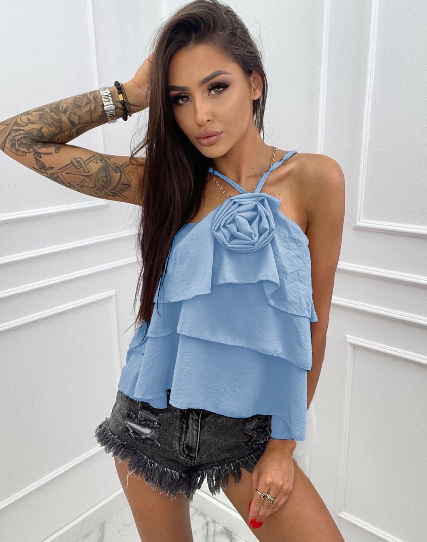 Екстравагантен дамски топ в модерен цвят. С ефектен дизайн на воали и стилна линия. С впечатляващо деколте, декорирано с голямо цвете. Подходящ за вечерна или ежедневна тренди визия.