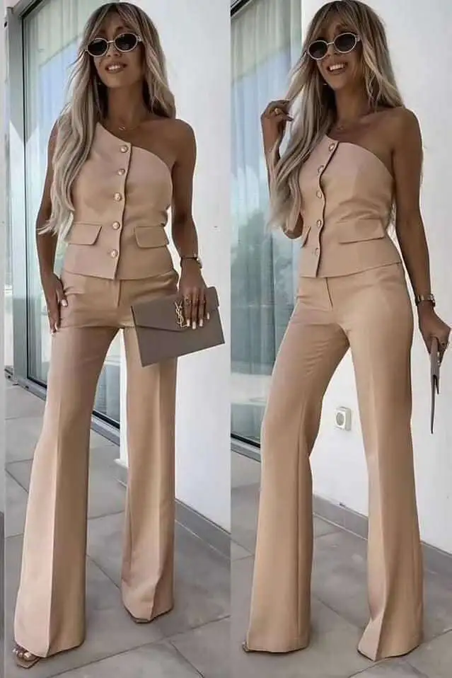 Дамски комплект от две части. Елече с едно рамо. Закопчаване с копчета. Широк панталон тип чарлстон -закопчаване с копче и цип. Подхоящ както за ежедневието така и за повод. Приятна на допир материя-полиестер.